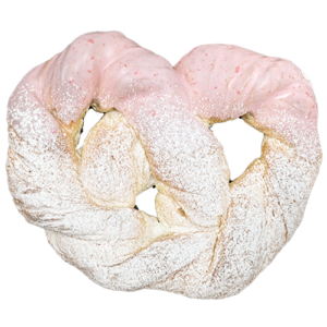 デニッシュパンをプレッツェルの形に焼き上げ、いちごチョコをトッピング