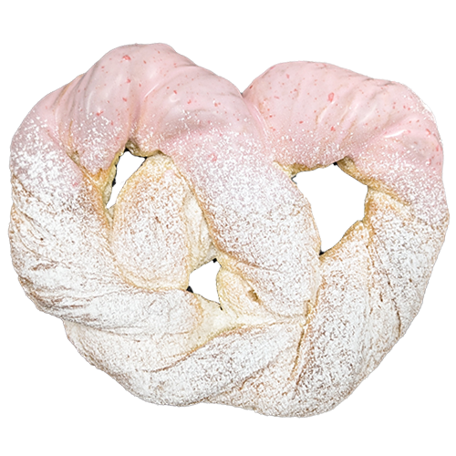 デニッシュパンをプレッツェルの形に焼き上げ、いちごチョコをトッピング